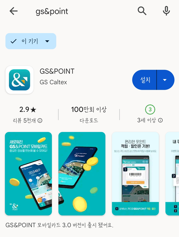 구글 플레이 스토어(Google PlayStore)에서 GS&POINT 어플을 검색하여 설치합니다.