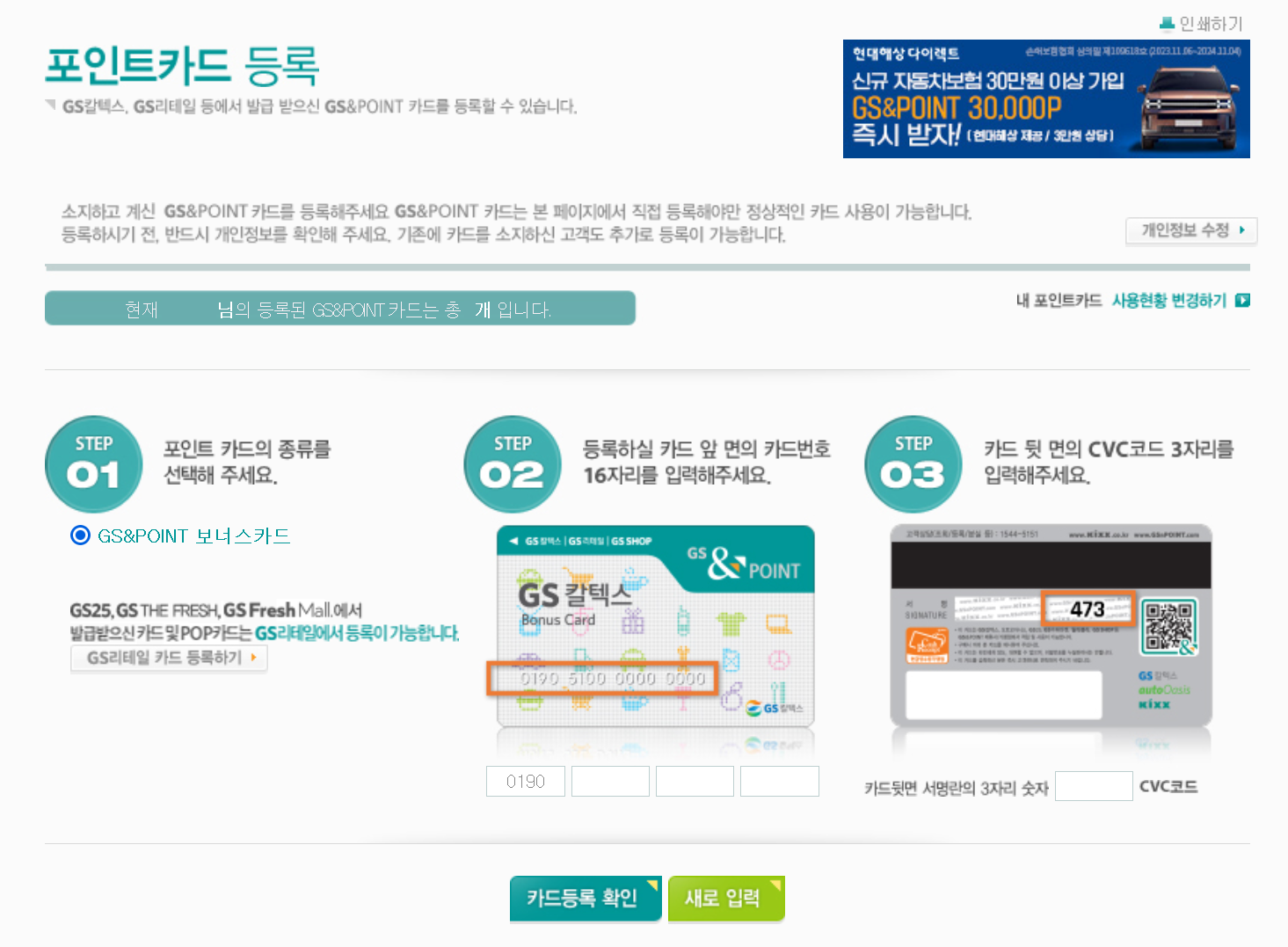 * GS&POINT 웹 페이지에서 실물 오프라인 카드 등록하기 *