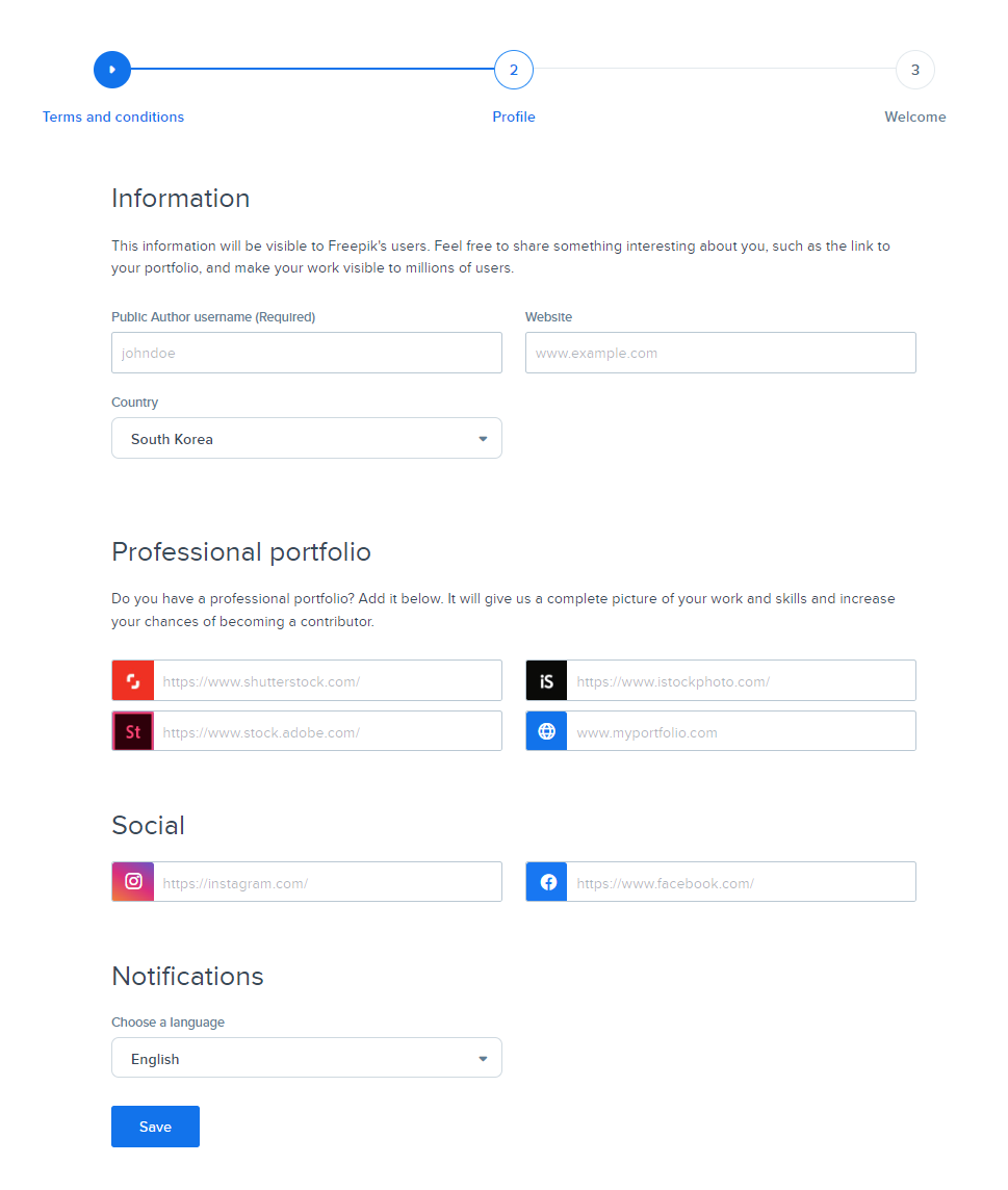 Country에서 South Korea(대한민국)을 선택하고, 원한다면 본인이 Website 주소나 포트폴리오나 SNS를 추가할 수도 있습니다.