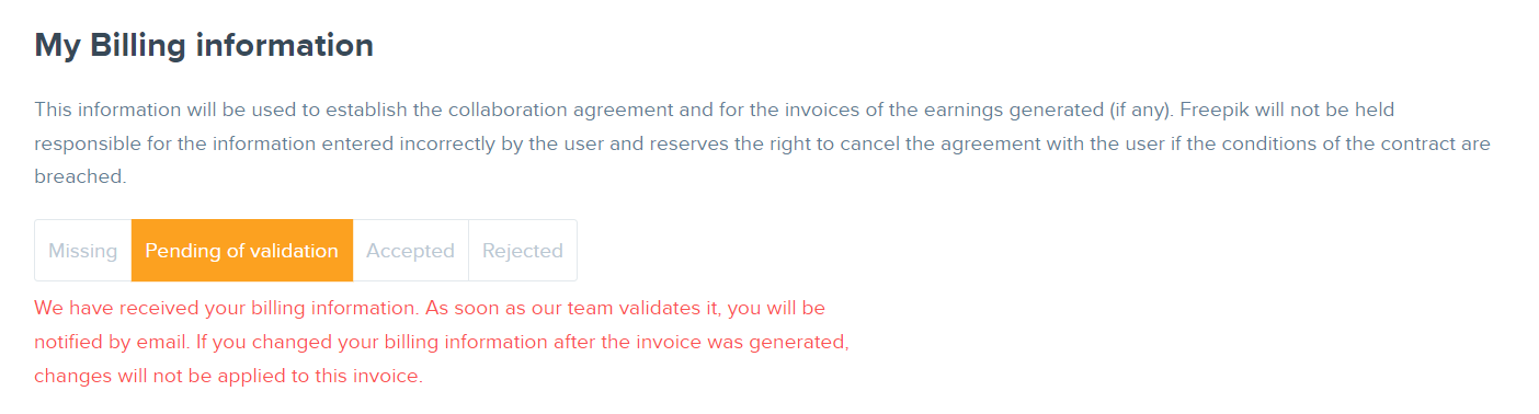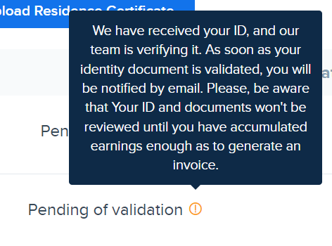 하지만 Pending of validation 옆에 위의 사진과 같이 주황색 느낌표가 나타나며 승인이 계속해서 Pending of validation에 머물러 있을 수 있는데, 주황 느낌표를 클릭해보면 서류 등록을 마쳤더라도 아직 수익이 없다면 서류가 검토되지 않는다는 안내 메시지가 뜨니 이미지 등록을 하여 수익 생성을 먼저 하고서 서류 승인을 기다려야 합니다.