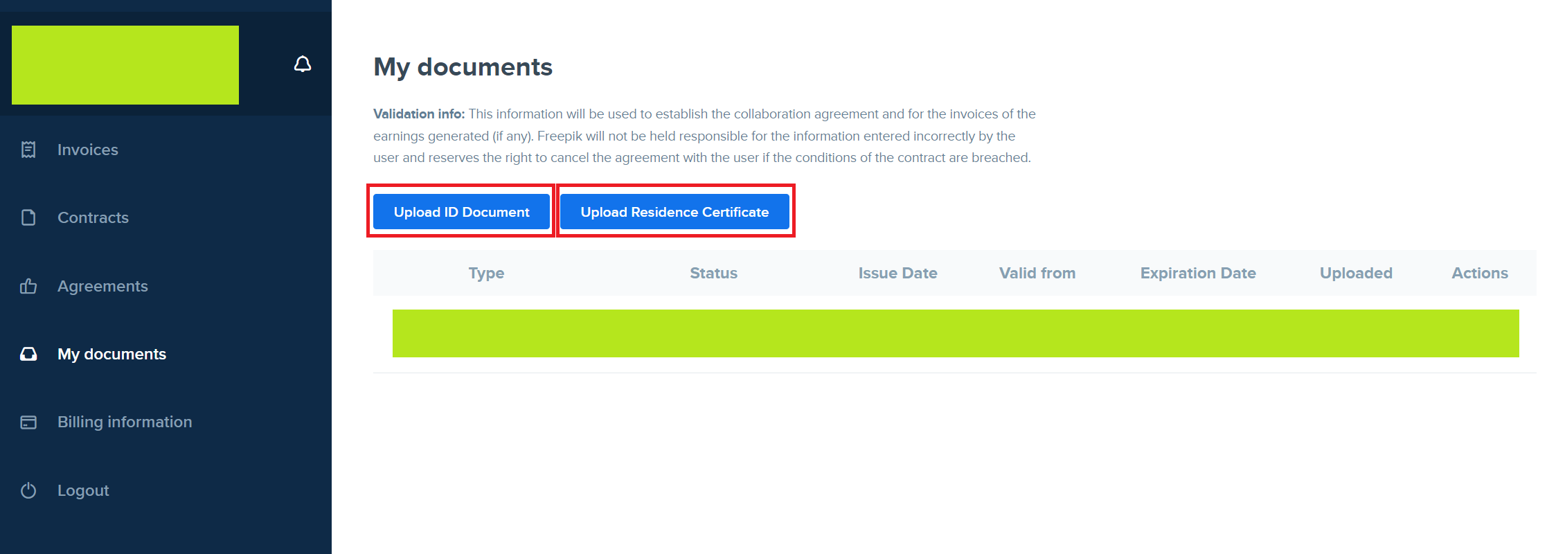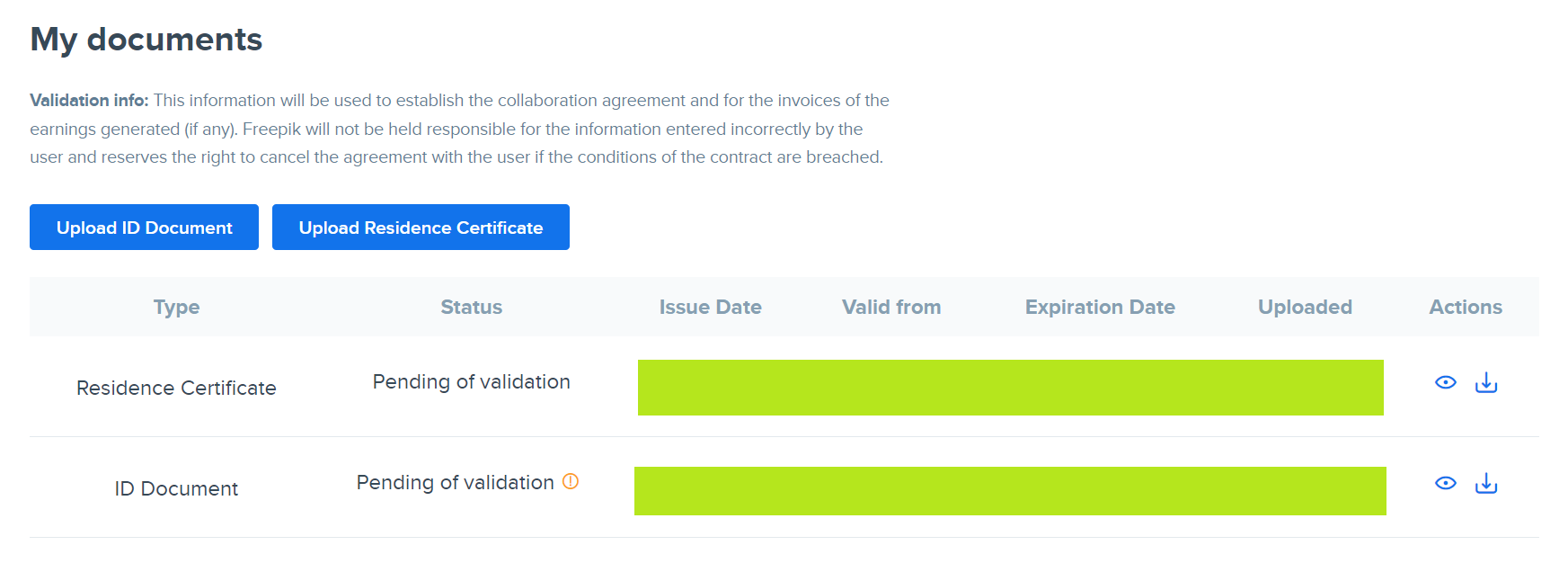 서류를 업로드하면 아래와 같이 서류 등록 상태가 Pending of validation으로 등록이 되게 됩니다.
