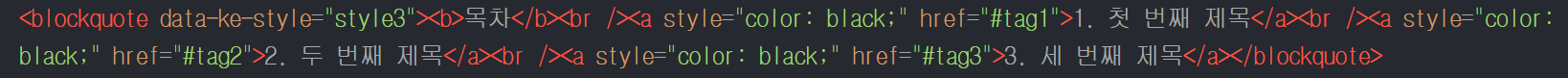 티스토리 게시글 목차 링크에서 밑줄과 파란색을 둘 다 없애려면 a태그의 style 속성에 text-decoration:none; 값과 color:black; 값을 추가합니다.