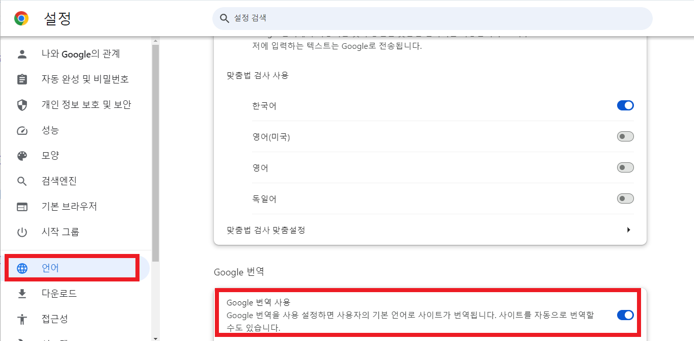 구글 브라우저 우측 상단의 세로 점3개 버튼(⋮) > 설정 > 언어 > Google 번역 에서 Google 번역 사용 버튼을 켜줄 수 있습니다.