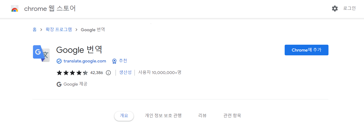 Google 번역을 클릭하면 나오는 페이지에서 Chrome에 추가 버튼을 클릭하여