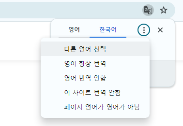한국어가 아닌 다른 언어로 번역하고 싶다면 구글 번역 아이콘 > 세로 점3개 버튼(⋮) > 다른 언어 선택 에서 할 수 있습니다.
