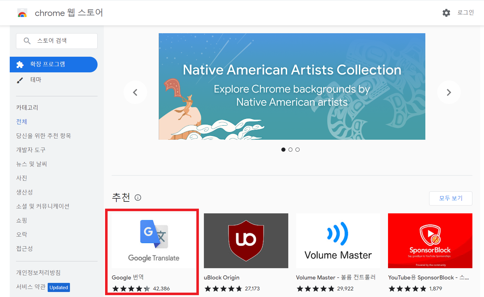Google 번역을 확장 프로그램으로 추가해줍니다.