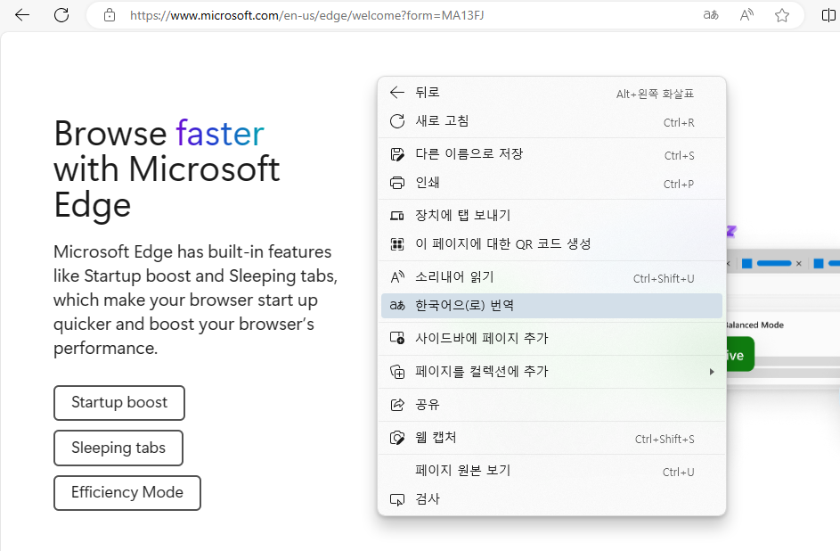 엣지(Edge) 브라우저에는 기본적으로 마이크로소프트 번역 기능이 탑재되어 있기 때문에 별도로 추가 기능을 설치할 필요가 없습니다.